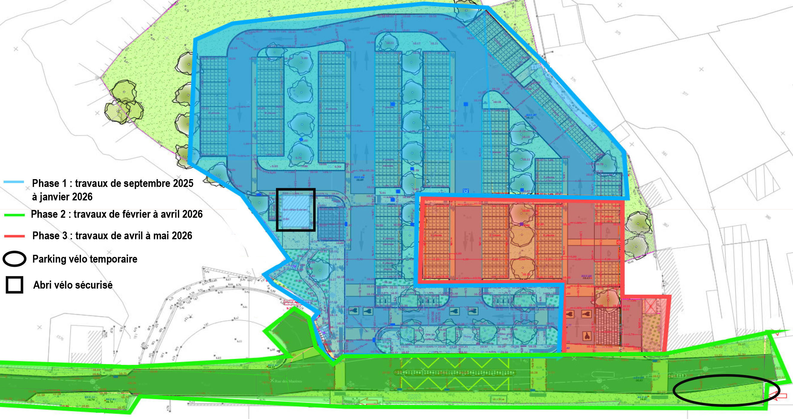 La première phase, du 29 septembre 2025 à janvier 2026, prévoit des travaux sur la partie ouest (en bleu sur le plan ici en téléchargement).